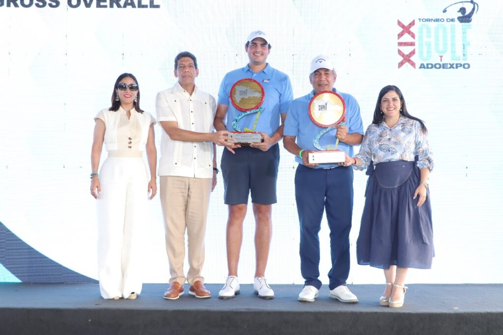 El equipo integrado por Carlos Castillo y Carlos Castillo junio logró el mejor “score gross overall”. La entrega de este premio principal estuvo a cargo de Biviana Riveiro, directora ejecutiva de ProDominicana, junto a Castillo y Roselyn Amaro Bergés, vicepresidente ejecutiva de Adoexpo.