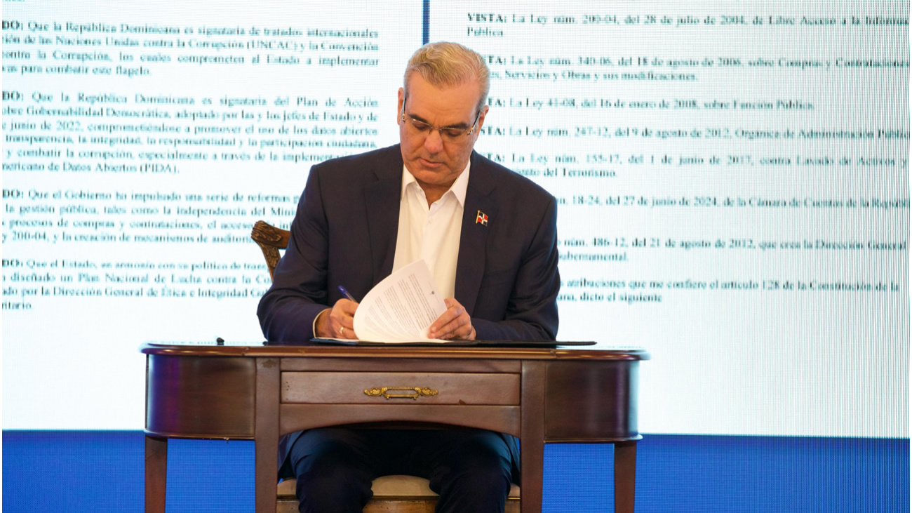 Santo Domingo, RD.- El presidente Luis Abinader firmó este lunes el Decreto 76-25, mediante el cual se crea la Comisión Presidencial para establecer el Sistema Nacional de Transparencia y Anticorrupción (CPTA). Esta iniciativa busca integrar y coordinar estrategias de prevención, auditoría, acceso a la información y recuperación de activos obtenidos ilícitamente, fortaleciendo así la lucha contra la corrupción.
