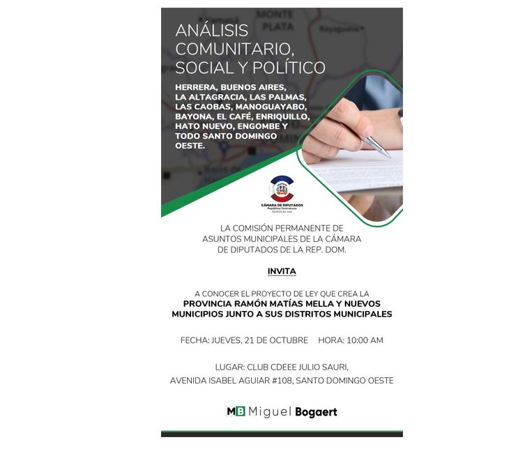 Santo Domingo, RD.- La Oficina Legislativa de diputado Miguel Bogaert Marra invita a los munícipes de Santo Domingo Oeste a participar en los debates de la vista pública que se harán este jueves 21 de octubre en el club de la Corporación de Empresas Eléctricas Estatales (CDEEE), en Herrera.