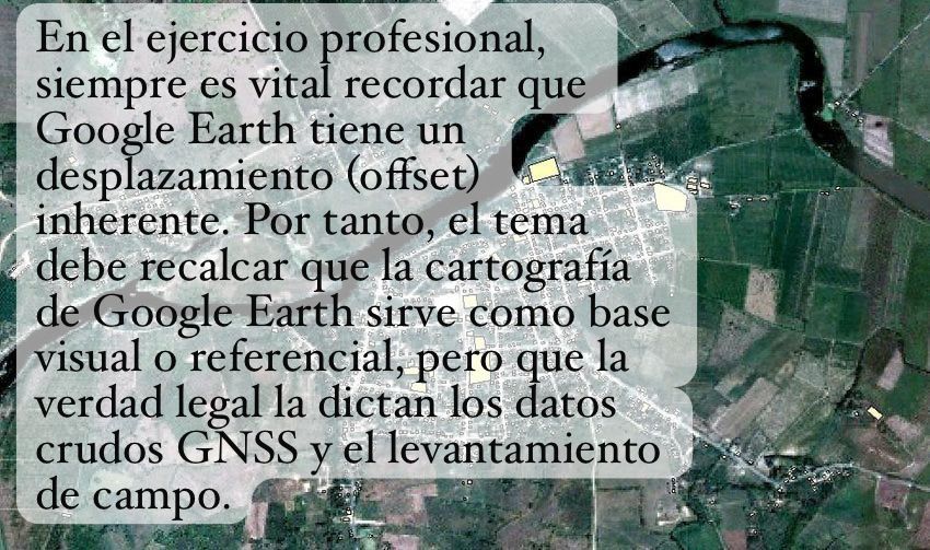 2-La «tiranía» sistema catastral digital: Existe una tendencia a digitalizar parcelarios antiguos sobre capas de Google Earth o mapas estatales sin considerar que esas capas pueden tener errores de georreferenciación de varios metros. Esto pone injustamente al agrimensor en la posición de tener que «justificar» por qué su equipo de alta precisión no coincide con una imagen satelital desplazada.